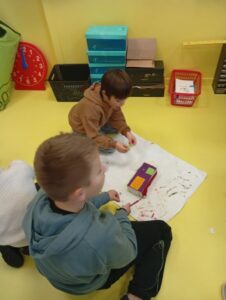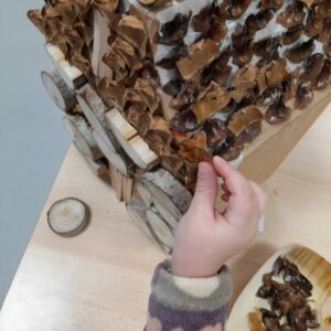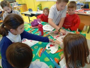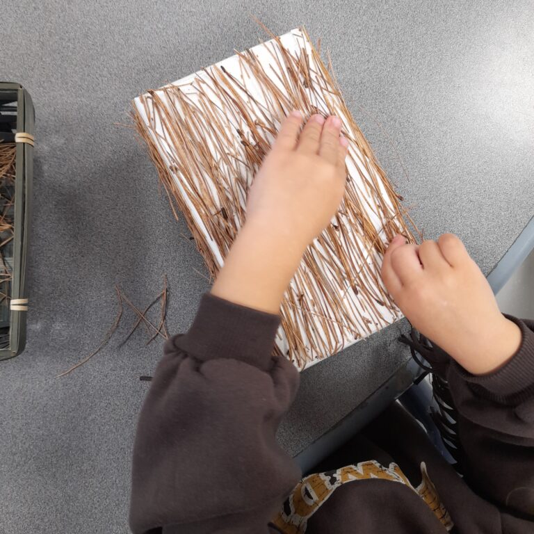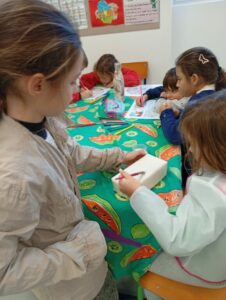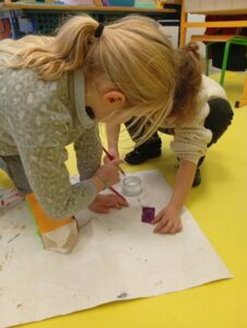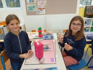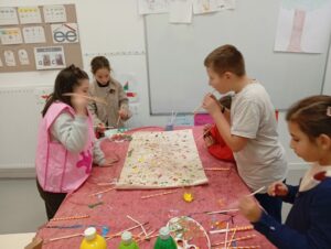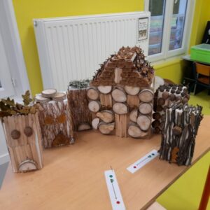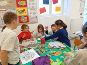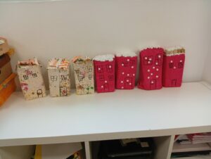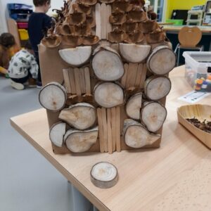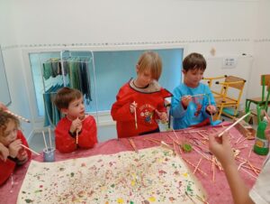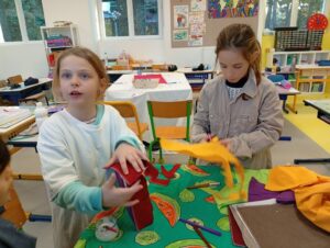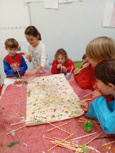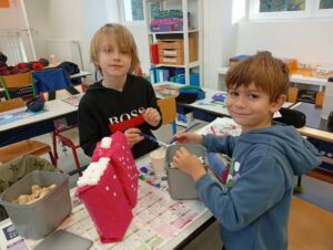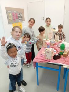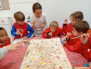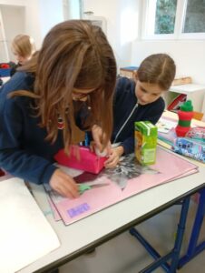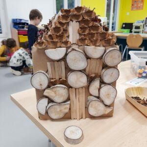 Comme tous les ans, nous profitons des ateliers multi-âges pour faire le village autour de la crèche. A partir des briques alimentaires récoltées pour une association talmondaise, nous créons des maisons, des immeubles en suivant le thème de l’année. Pour cette année sur le respect, nous avons opposé deux visions : un village avec des « trésors » de la nature et un village recyclage de déchets. A partir de tous ces éléments et en s’inspirant parfois d’artistes, nous avons mis en valeur tout ce que nous offre la pinède et ce qu’on jette (morceau de tissu, journaux, capsules…). Il y a eu beaucoup d’entraide entre nous, chacun a apporté sa pierre à l’édifice pour un résultat dont nous sommes tous fiers!