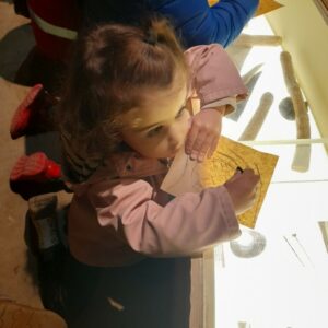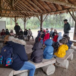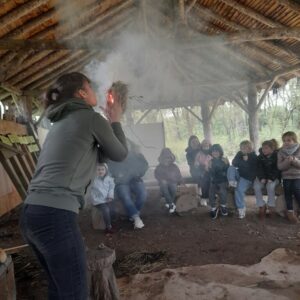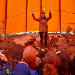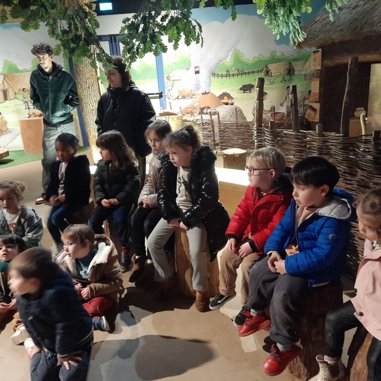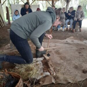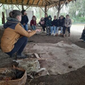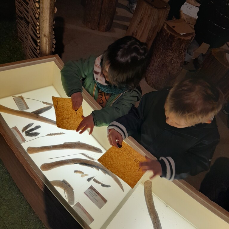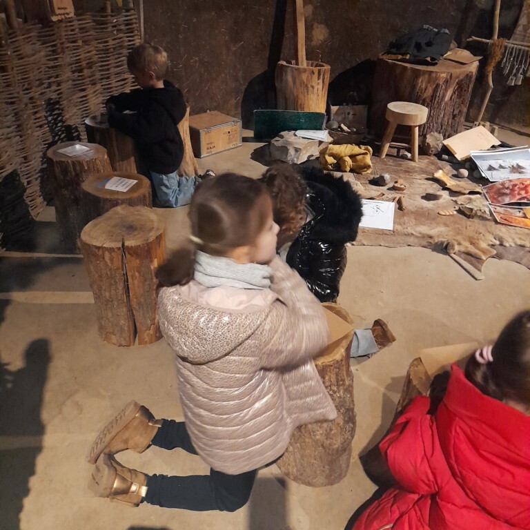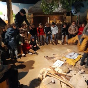 Sous un ciel capricieux, nous sommes allés au Cairn rejoindre. Nous avons fait un petit tour sous la tente avant de regagner un abri. Jessica nous a montré comment lancer loin une sagaie avec un propulseur pour chasser un animal éloigné. Elle nous a ensuite montré comment les hommes préhistoriques faisaient du feu, c’était magique et nous étions impressionnés. La matinée s’est poursuivi dans le musée où nous avons vu différentes embarcations et nous avons fini en dessinant avec du charbon de bois comme de petits cro magnons cro mignons!